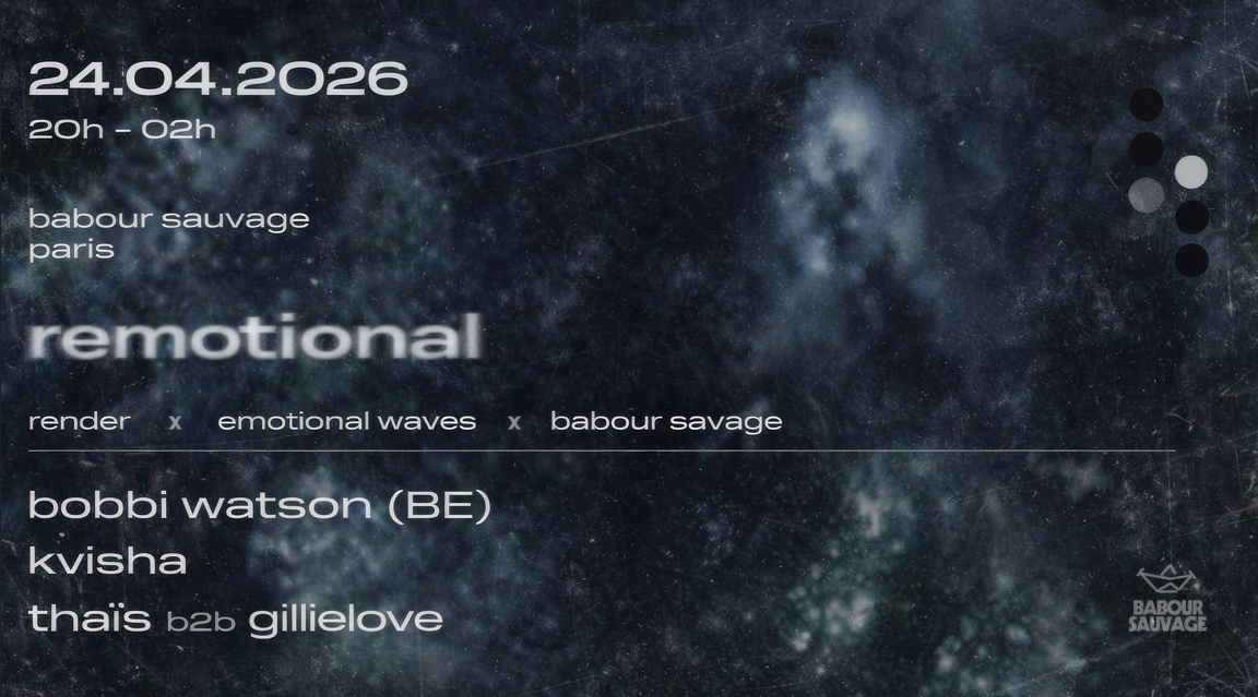 Render (Station Station) s'associe à Emotional Waves (Gimic//Radio Sofa) et Babour Sauvage pour organiser une soirée deep, minimal et bass musique, avec Bobbi Watson (be), Kvisha et Thaïs en b2b avec Gillielove.