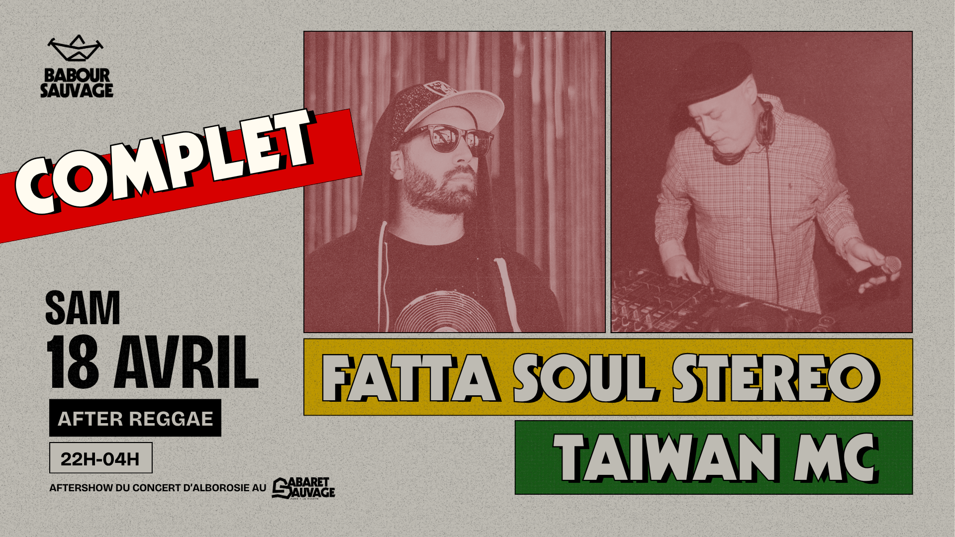 Après le concert d'Alborosie, la soirée continue au Babour Sauvage avec un after reggae mené par deux figures de la scène sound system.Fatta, membre fondateur du sound system parisien Soul Stereo, posera ses disques au Babour avec une selecta diggé dans plus de 60 ans de musique jamaïcaine, mêlant reggae, ska, dub, bass music, dancehall.